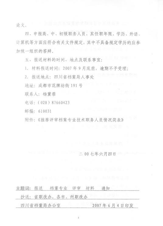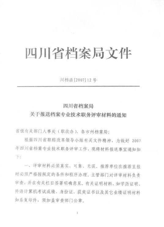 现将四川省档案局《关于报送档案专业技术职务评审材料的通知》(川档函[2007]12号)转发你们,请符合条件的人员到人事处报名。
