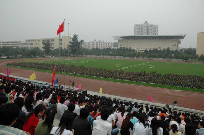 9月27日下午,四川外语学院成都学院2007级新生开学典礼暨军训结业仪式在运动场隆重举行。四川外语学院成都学院党委书记、院长尹大家教授,四川德瑞企业发展有限公司总经理叶家郁先生,四川德瑞教育集团总经理王小英女士,中国人民解放军77108部队军训团团长钟智勇同志,四川外语学院成都学院党委副书记、副院长李泽同志,四川外语学院成都学院副院长何英副教授,四川外语学院成都学院副院长李葵同志,四川外语学院成都学院院长助理徐树森副教授,中国人民解放军77108部队副参谋长杨根华同志出席开学典礼暨军训结业仪式。在主席台就坐的还有学院各部门、系负责人以及外籍教师代表。开学典礼暨军训结业仪式由副院长李葵同志主持。