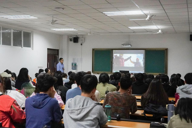 喜好摩托越野、帆板、冲浪、滑翔伞、登山滑雪、航海、高空跳伞、翼装飞行,幽默风趣的刘教授与同学们分享了自己与队友驾驶帆船从南美洲最南端的威廉姆斯港口赴南极内陆、攀登喜马拉雅南坡未登峰以及前往中东沙漠的种种探险经历。在回忆自己与队员遭遇因严峻的气候和地域条件造成的冰崩和雪崩时,他向大家传授了自己在极寒地带的生存和自救经验。